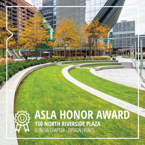 150 North Riverside is a 53-story high-rise office building along the South Branch of the Chicago River. The site includes a plaza that connects the main entrance of the building to Randolph Street, a 300-foot-long Riverwalk Promenade that allows pedestrians to overlook the water’s edge with terraced seating, and a green space park to break up the busy, urban surroundings. The Illinois Chapter of ASLA has awarded this project with an Honor Award in the Design (Built) category.