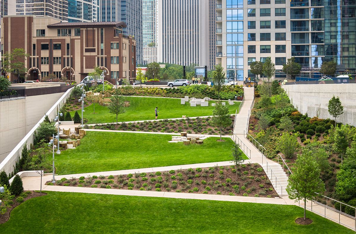 Cascade Park sits on a front-row site where the Chicago River meets Lake Michigan, a few blocks north of the iconic Maggie Daley and Millennium Parks between Lakeshore Drive and Michigan Avenue. Positioned between the city’s signature skyline and the limitless horizon of Lake Michigan, the oblique tilt in the park plane provides an immersion between these two powerful qualities that define the unique identity of Chicago, while also closing a critical missing link for pedestrians to the lake and beyond. Part of a four-acre multi-tower mixed-use development, Cascade Park provides a public amenity for local residents and the larger community, as well as a convenient shortcut for active mobility between world-famous Chicago Landmarks: the city and the lake.