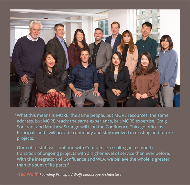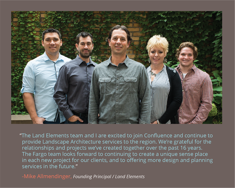 We’re excited to share that Wolff Landscape Architecture (Downtown Chicago) and Land Elements (Downtown Fargo) are now part of Confluence. Our team welcomes the skilled design professionals from these renowned firms as we expand our reach into new markets, while also adding to the depth and breadth of our core capabilities.