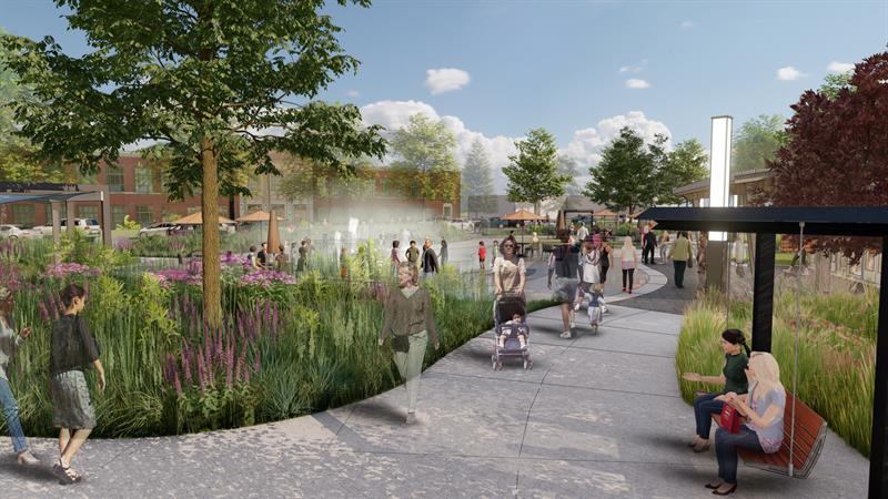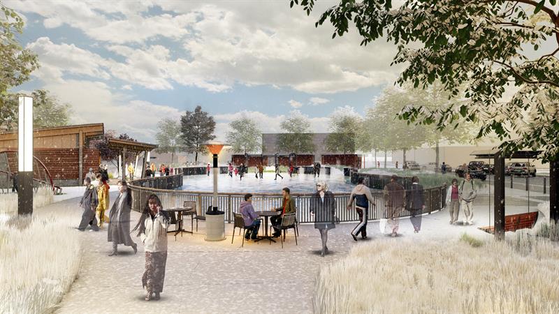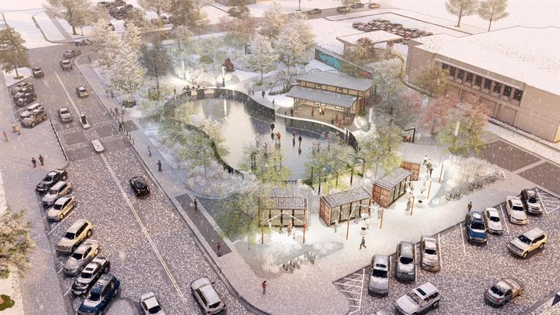 The Plaza’s design will evoke a natural feel, with lines that blend with the landscape, winding paths, and lush greenery. The new design includes a water runnel – the community’s top choice for a water feature – as well as bubbling water element for children to enjoy in the summer. Public art and sculptures from local artists are additionally planned throughout the park. The design also includes the ability to transition into a winter recreational skating facility with a unique ribbon design.