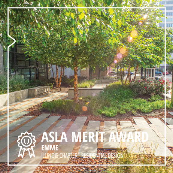 The landscape consists of two areas, the pocket park and the third-floor amenity deck. The park is organized around a wandering garden path of bluestone and brick bands furnished with L-shaped benches in a landscape of multi-stem Whitespire birch trees and low shrubs and groundcover. The amenity deck features a large gathering area with a firepit, a tilted plane of grass surrounded by tiered seating, and a walkway flanked by two rows of Winter King hawthorns. The west end of the deck is devoted to a plot of raised beds, bringing productive urban agriculture to this urban location. The Illinois Chapter of ASLA recently awarded EMME with a Merit Award in the residential design category. Congratulations to EMME, Gerdling Edlen and our project partners for making this vision come to life!