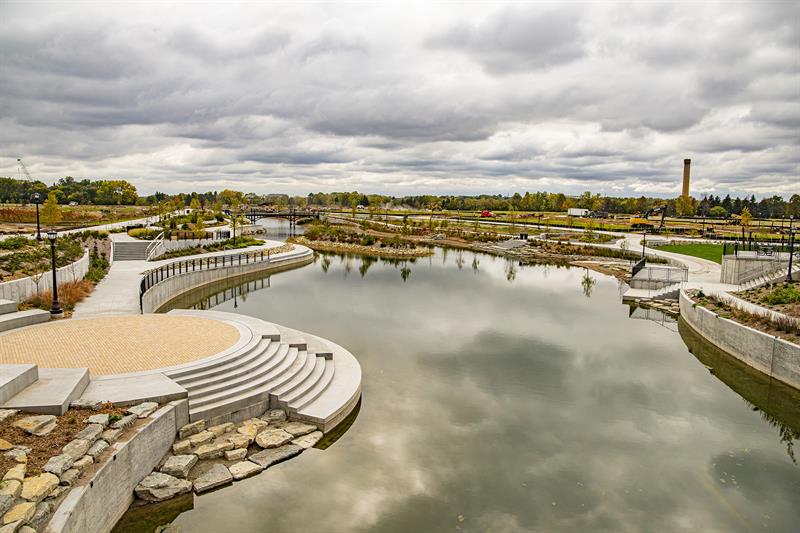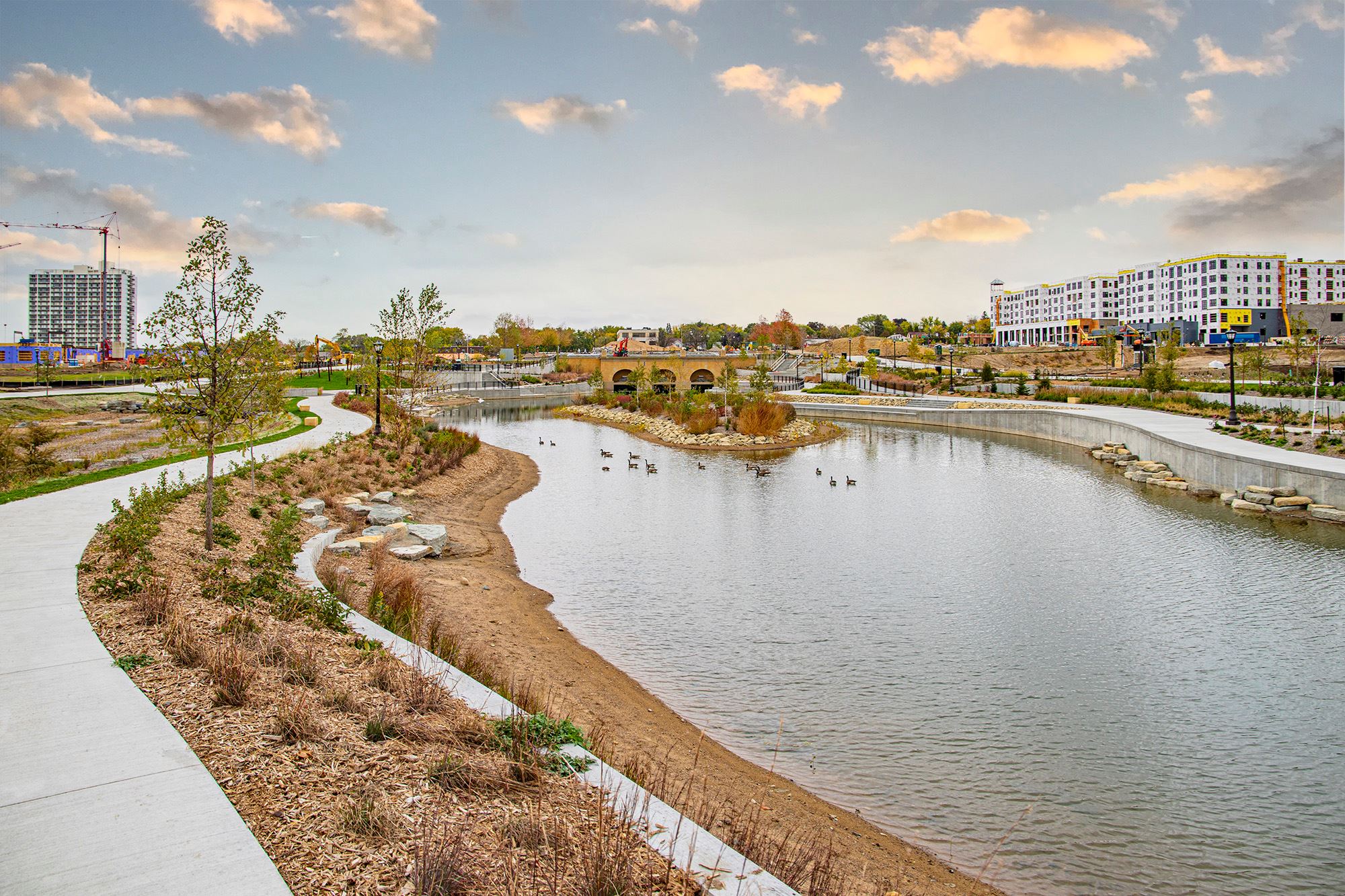 We recently took a trip over to St. Paul, Minnesota to check out the construction progress on Highland Bridge. Developed by Ryan Companies US, Inc., this 120+ acre mixed-use development is stitched together with over 55 acres of green space, bike and pedestrian paths, green infrastructure elements, and recreation facilities and is set to become the most sustainable development in Minnesota’s history. Confluence led a collaborative design process for all public realm plazas, parks, open spaces and green infrastructure.