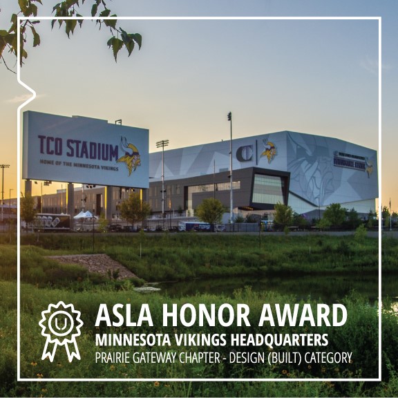 We are elated to announce the Minnesota Vikings Headquarters: Practice Facility and Vikings Lake Development has received an Honor Award for Design by the Prairie Gateway ASLA Chapter! This 200-acre training facility is home to the NFL team, boasting a state-of-the-art headquarters and training facility weaved together by a flexible and imaginative landscape fabric. We are excited our client’s innovative vision for this project has been recognized in this way, and we find great satisfaction in knowing this place was designed for people to connect with and embrace the sport they love. This is a fantastic win for our client and the entire Minnesota Vikings community!
