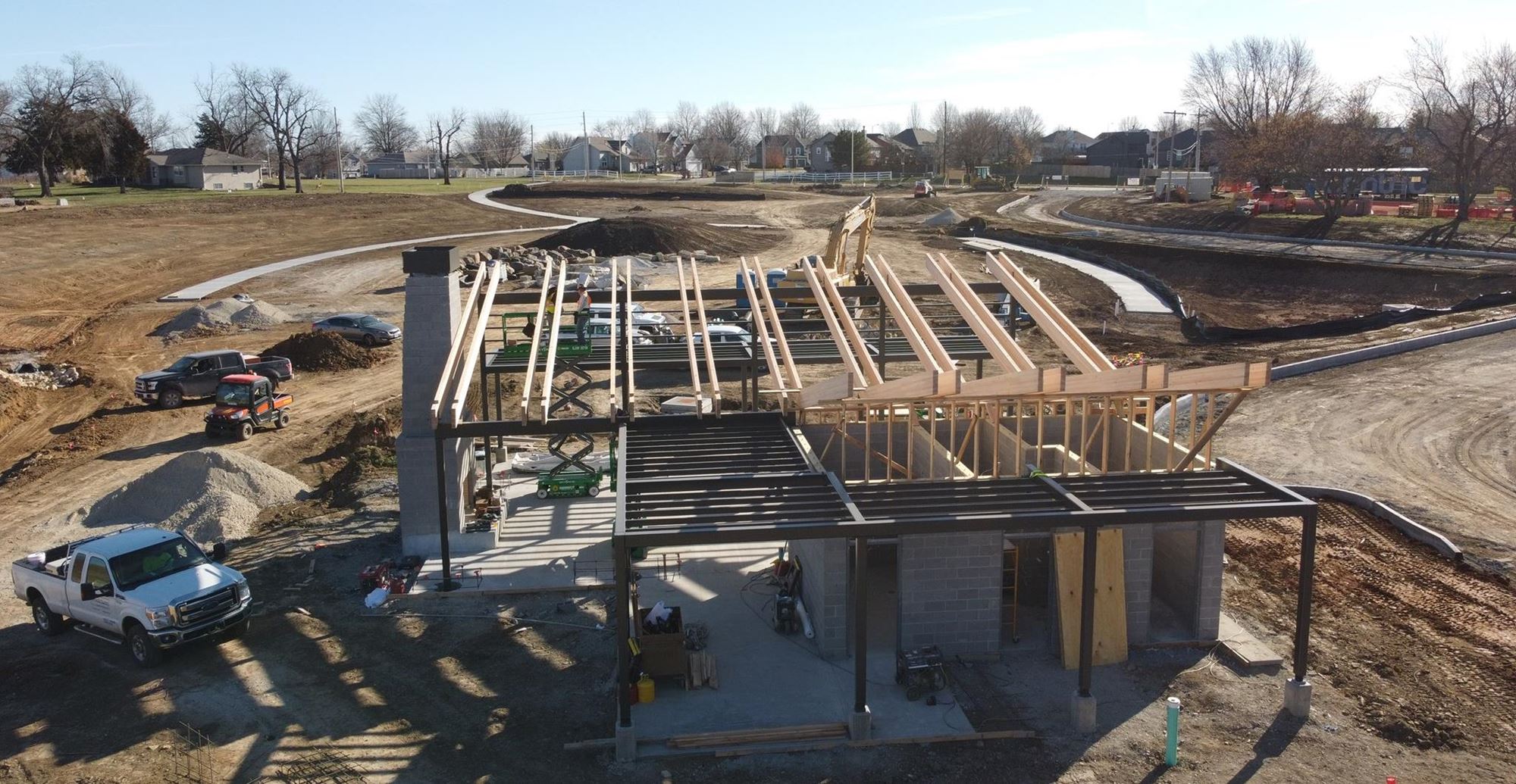 Wilder Bluff Park is really coming along at 55th and Belmont Drive! Here are a few pictures showing the progress. Crews are doing a lot of work on finishing up the park shelter as well as starting to place the boulders for the splash pad area.