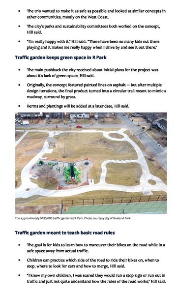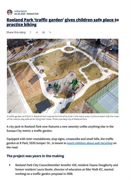 A recent park project designed by Confluence included a new type of garden for kids – a “traffic” garden that helps teach kids how to safely navigate their neighborhood on a bicycle. Hank Moyers in our Kansas City office led the development of this new addition in Roeland Park, Kansas that is unique to the region and is already a hit with the kids. We look forward to seeing the rest of the park open in the Spring of ’23.