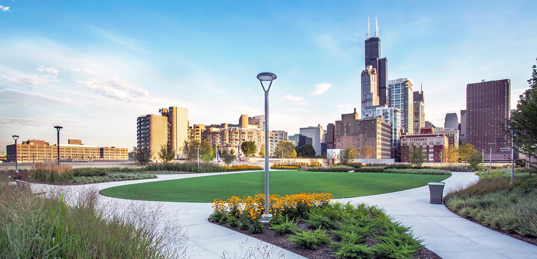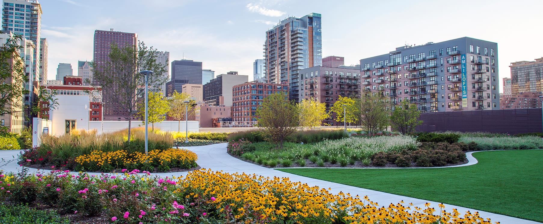 The design team collaborated closely with the structural engineer to accommodate a random placement of trees on the roof. The final structural system provided more flexibility in the creation of the park, allowing an informal, naturalistic landscape with native prairie plantings. These spaces were organized around a curvilinear walkway providing students, faculty, and visitors spectacular views of the Chicago skyline to the north and east.