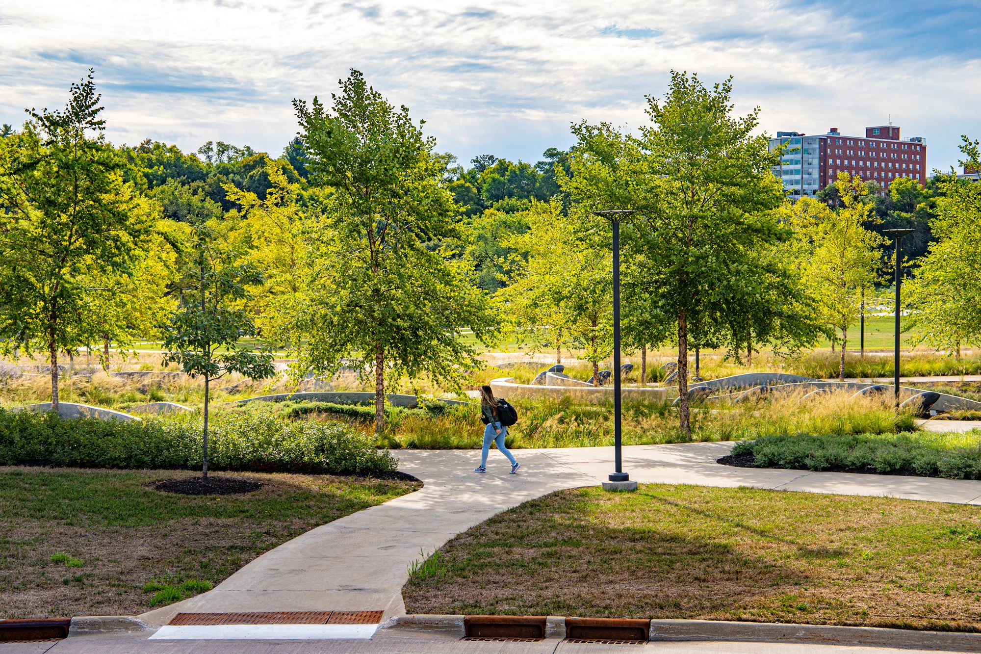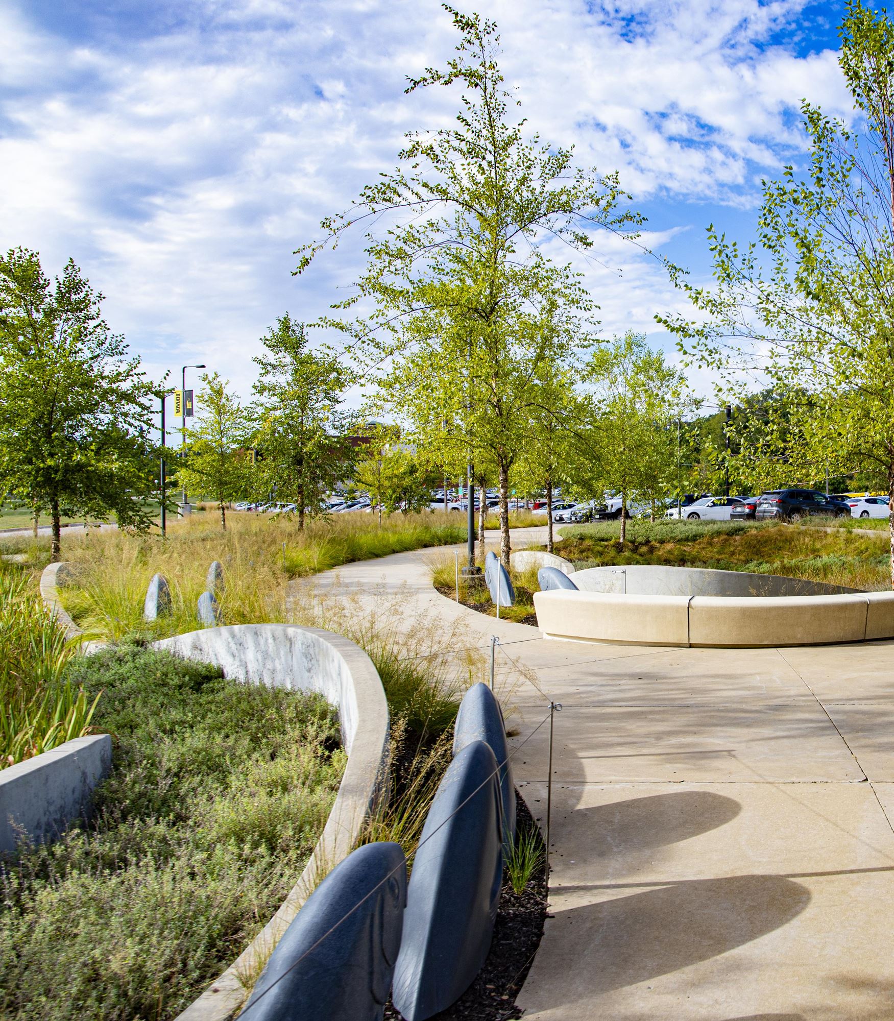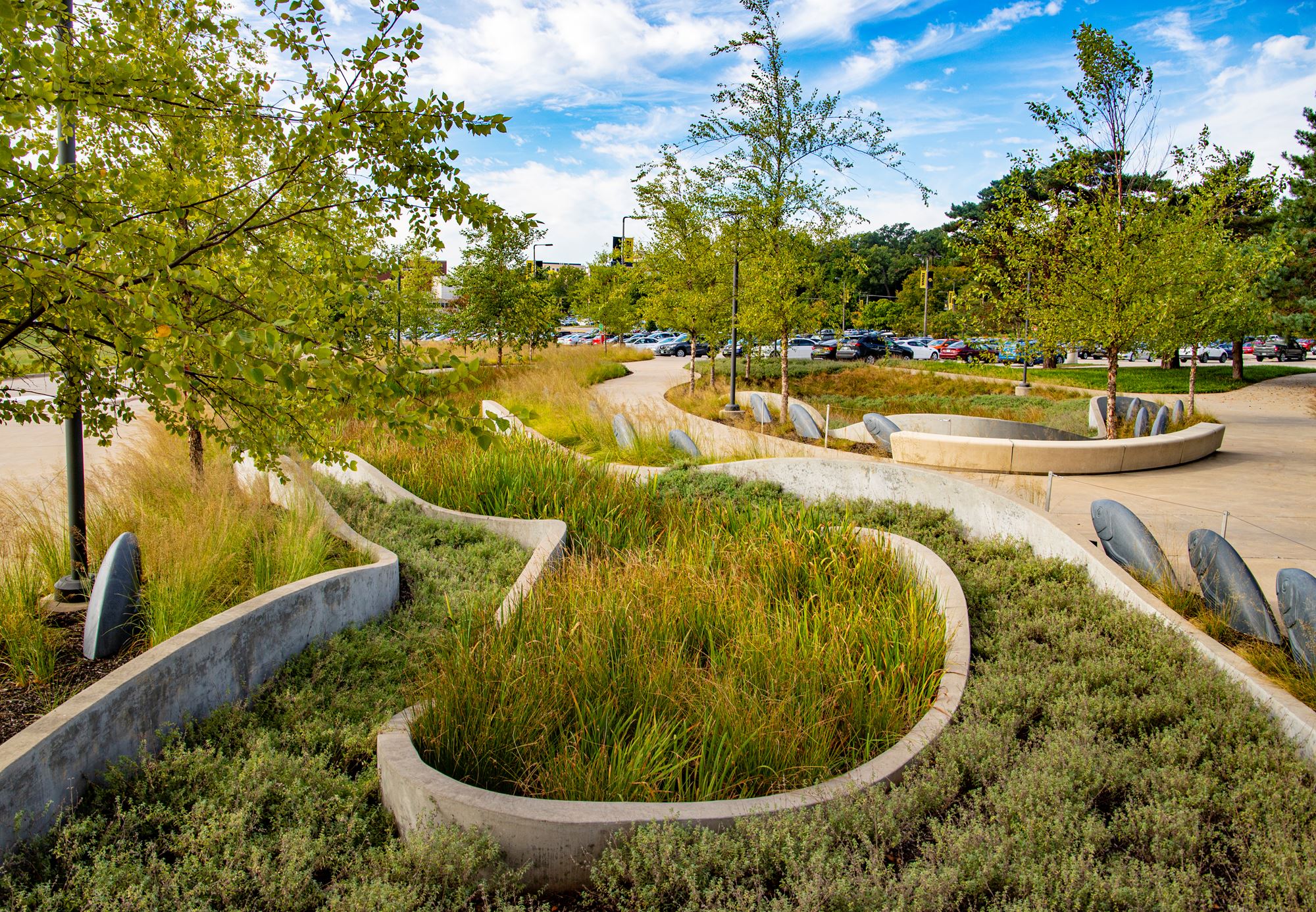 The project includes several entry plazas and a small outdoor performance venue surrounded by sculptured site depressions crafted to divert, treat and infiltrate site stormwater.