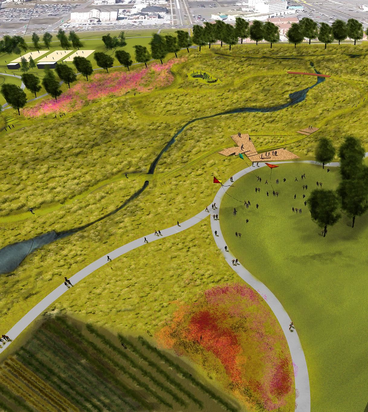 The project also laid the groundwork for the community to continue exploring connections, learning about its diverse cultures while creating a self-sustaining, hydrologically functioning stormwater basin true to the prairie ecology. Our team synthesized and translated a body of design ideas and works of shared authorship by artists and the community into construction documents that maintained the conceptual integrity of artist Jackie Brookner’s initial vision. We facilitated community design events, translated the clay models and drawings of local artists into digital models and drawings for transdisciplinary approval, and provided cost estimating, bidding and construction administration services.