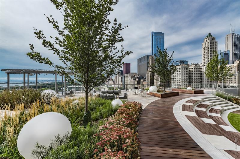 For a community in a dense urban environment in Chicago, where we had a third floor 45,000-square-foot podium connecting two residential towers to work with, ownership was concerned with the cost and maintenance associated with detailed garden planting and extensive hardscape on such a vast space. To mitigate those concerns, we utilized no-mow fescue throughout most of the deck punctuated by sculptural tree islands.