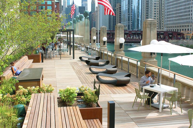 This 500+ foot swath of park transforms an ordinary overlook area into an urban, riverside destination for one of Chicago’s most iconic buildings, the Merchandise Mart.