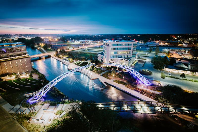 A 70-foot-tall sculpture stretching 240 feet across the Big Sioux River, Arc of Dreams is designed by South Dakota’s Artist Laureate, Dale Lamphere. The 18-foot gap at the center of the arc represents the leap of faith all dreamers must take. Confluence led the design and infrastructure for the small plazas at the base of each of the two sculpture segments while also consulting on the placement of the artwork itself.